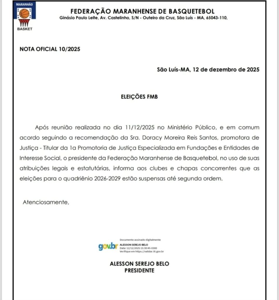 A eleição para presidência da Federação Maranhense de Basquetebol (FMF), referente ao quadriênio 2026/29, foi suspensa, sem nova data já definida para ser realizada.
