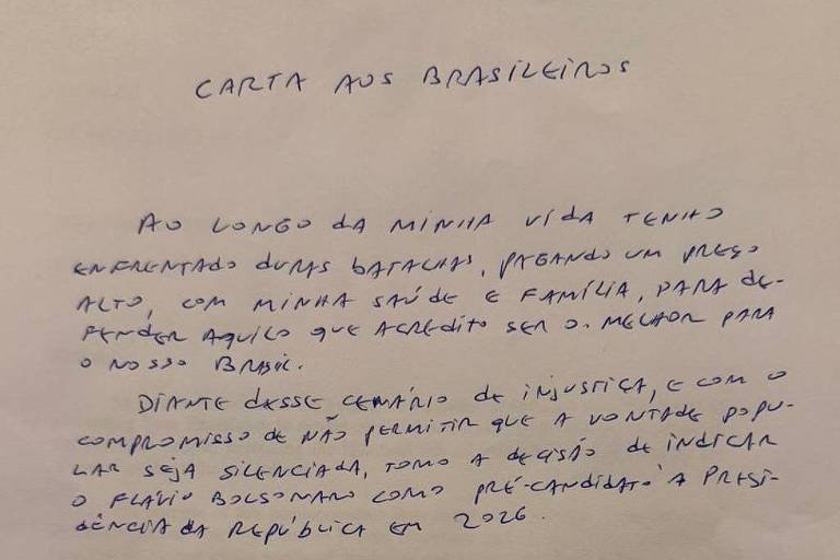 É nesse contexto que o ex-presidente afirma não permitir que “a vontade popular seja silenciada” e anuncia que torna pública sua “disposição de indicar o futuro brasileiro como pré-candidato à Presidência da República em 2026”.