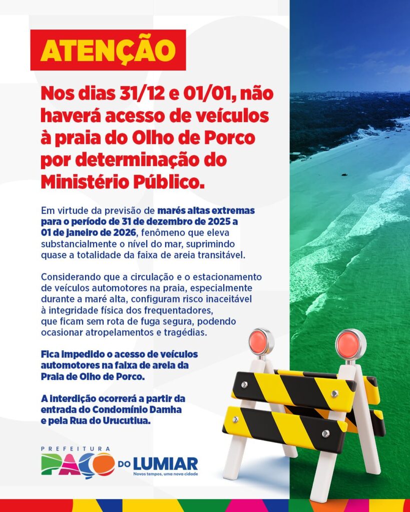 A Prefeitura de Paço do Lumiar informa que, por determinação do Ministério Público, estará proibido o acesso de veículos automotores à faixa de areia da Praia do Olho de Porco nos dias 31 de dezembro de 2025 e 1º de janeiro de 2026. A medida tem caráter preventivo e visa garantir a segurança dos frequentadores durante o período de grande fluxo nas festas de fim de ano.