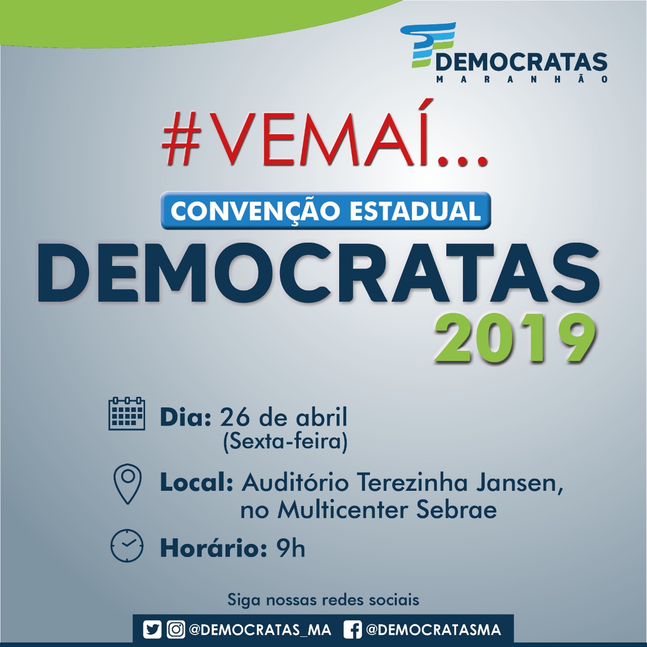 O presidente estadual do Democratas no Maranhão, deputado federal Juscelino Filho (DEM-MA) confirmou a data da Convenção Estadual 2019 do partido para esta sexta-feira (26). O evento será realizado a partir das 9h no Auditório Terezinha Jansen, no Multicenter Sebrae, e contará com a presença do presidente nacional do DEM, ACM Neto, e de outras importantes lideranças políticas da legenda no Estado.