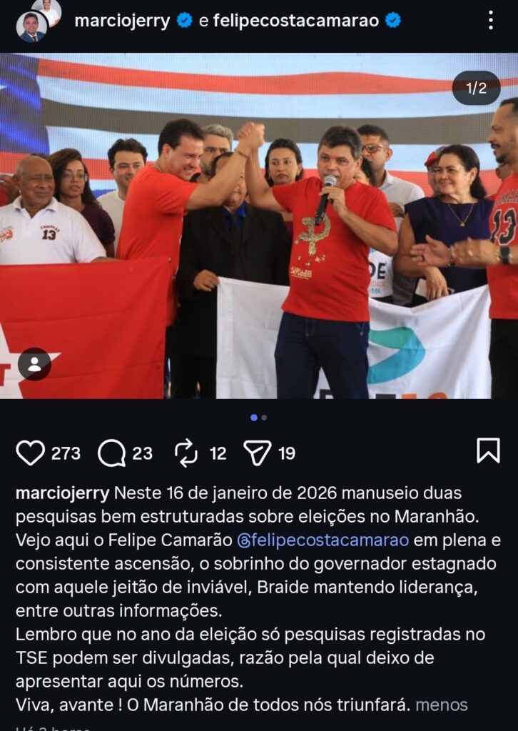 O deputado federal Márcio Jerry (PCdoB) mencionou nesta sexta-feira, 16, suposta pesquisa eleitoral que apresentaria o pré-candidato do PT ao Governo do Maranhão, Felipe Camarão, em “plena e consistente ascensão”.